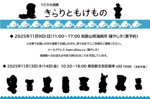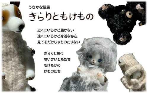 同日、礒やしき はなれ にて、うさかな個展「きらりともけもの」を開催いたします
